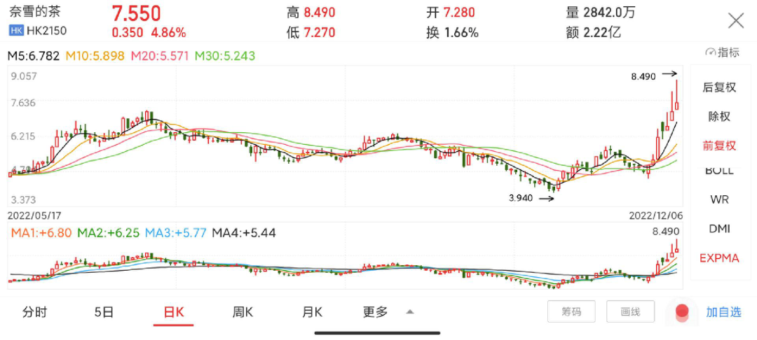 截止12月6日收盤,奈雪股價(jià)為7.55港元/股,期間盤中一度拉升至8.49港元/股,這創(chuàng)下了奈雪大半年時(shí)間以來的新高。