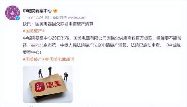 據(jù)微博名為“中城院要案中心”用戶稱,國美電器有限公司因拖欠供應(yīng)商數(shù)百萬貨款,經(jīng)催要不能償還,被向北京市第一中級人民法院破產(chǎn)法庭申請破產(chǎn)清算,法院已啟動審查。