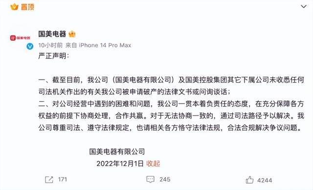 12月1日晚間,針對“因欠款被申請破產(chǎn)清算”一事,國美電器發(fā)布嚴(yán)正聲明。