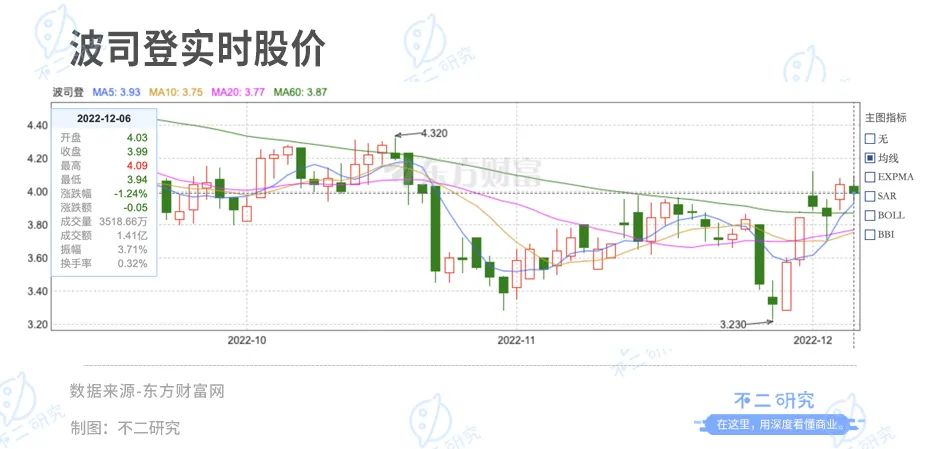 財報公布次日,波司登的股價下跌超10%。截至2022年12月6日收盤,波司登報收3.99港元/股,對應(yīng)總市值434.4億港元;相較一年前的市值最高點680億港元,市值縮水過半。