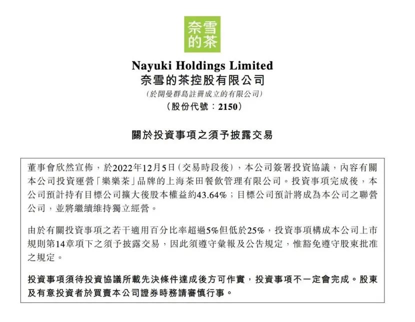 12月5日,奈雪發(fā)布公告稱,已完成對樂樂茶(上海茶田餐飲管理有限公司)的投資協(xié)議,以5.25億元收購樂樂茶43.64%股權(quán)。