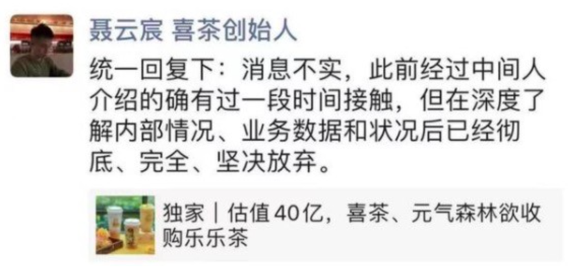 隨后聶云宸在朋友圈公開否認收購樂樂茶:“消息不實,此前經(jīng)過中間人介紹的確有過一段時間接觸,但在深度了解內(nèi)部情況、業(yè)務數(shù)據(jù)和狀況后已經(jīng)徹底、完全、堅決放棄!