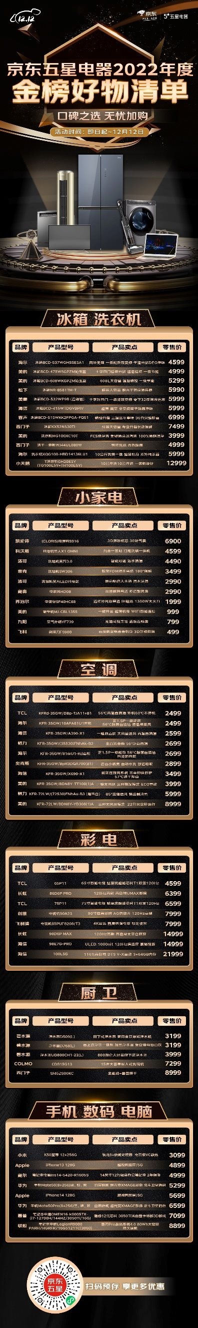 通過(guò)高效實(shí)現(xiàn)消費(fèi)者畫(huà)像描摹,以真實(shí)購(gòu)買(mǎi)信息為基礎(chǔ)并細(xì)化消費(fèi)者不同需求,12.12活動(dòng)期間,京東五星電器全面梳理空調(diào)、冰箱、洗衣機(jī)、彩電、廚衛(wèi)、小家電、手機(jī)、數(shù)碼、電腦等全品類(lèi)具備價(jià)格、貨源等優(yōu)勢(shì)的超高性?xún)r(jià)比商品納入2022年“金榜好物清單”。比如說(shuō)價(jià)格下探到2499元的1.5P一級(jí)能效除菌自清潔的海爾智能空調(diào)、4599元的65寸TCL智能電視、4599元的537升一級(jí)能效雙變頻風(fēng)冷無(wú)霜海爾冰箱、3999元的免熨除菌蒸汽洗100%除螨潔凈美的洗衣機(jī)、3199元的家用直飲納濾碧水源凈水機(jī)、799元無(wú)油可視烹飪九陽(yáng)空氣炸鍋、4490元的智能雙驅(qū)潔水清潔的添可洗地機(jī)芙萬(wàn)3.0、5299元的8+256G華為Mate50、4999元的戴爾14英寸12代輕薄辦公筆記本、3099元的12+256G小米K50至尊版……還有聚焦健康、體驗(yàn)、智能等家電新品發(fā)布,參與預(yù)存還可以享受更多優(yōu)惠。