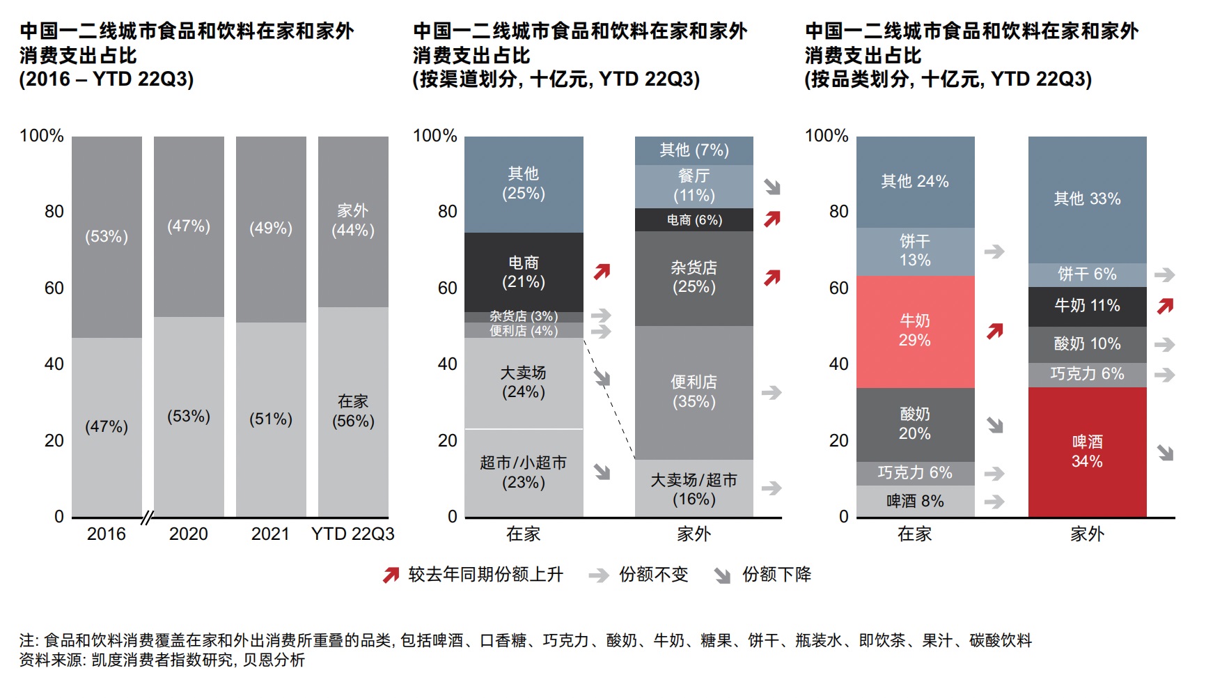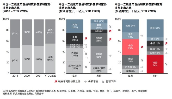 牛奶仍然是最大品類,在一二線城市的在家和家外消費中的份額不斷擴大,而酸奶和巧克力等非必需的小確幸品類則份額保持不變或有所下滑。由于疫情堂食限制,啤酒的家外消費場景遭遇重創(chuàng),餐廳的消費占比也出現(xiàn)下滑。