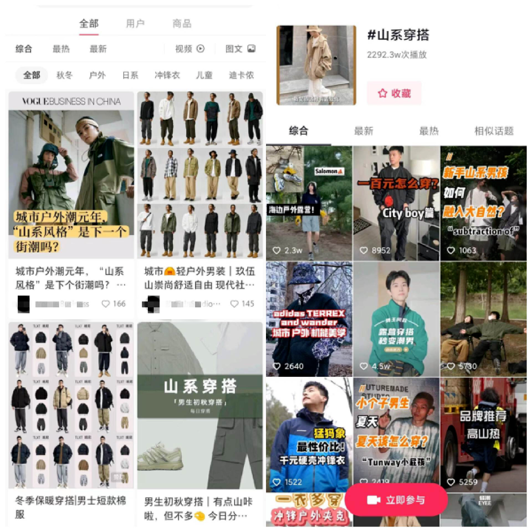 隨著“疊加都市戶外風(fēng)”穿搭風(fēng)格的興起,越來越多的沖鋒衣品牌開始出現(xiàn)在各大社交平臺穿搭博主的視頻中。其中,小紅書上,沖鋒衣穿搭相關(guān)筆記超過7萬條;抖音上“山系穿搭”話題播放量2292.3萬次。