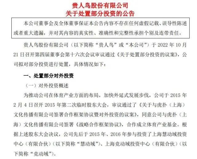 直到2018年8月,貴人鳥將其持有的虎撲股權悉數(shù)清倉,此后開始陸續(xù)拋售此前轉型收購的資產(chǎn)。2022年10月22日,貴人鳥發(fā)布公告稱,繼續(xù)持有慧動域、競動域已不符合公司目前的戰(zhàn)略發(fā)展需要,公司擬對這部分投資進行處置。