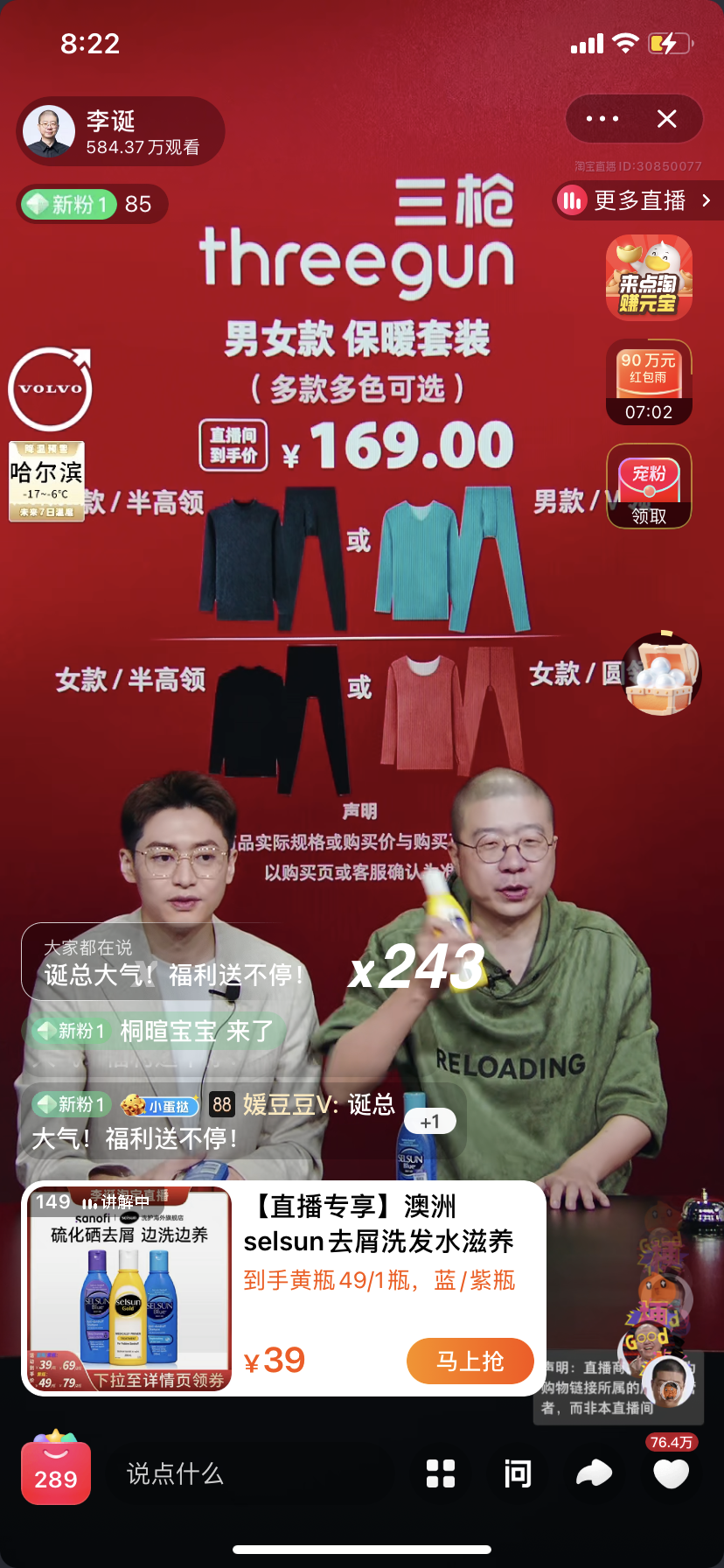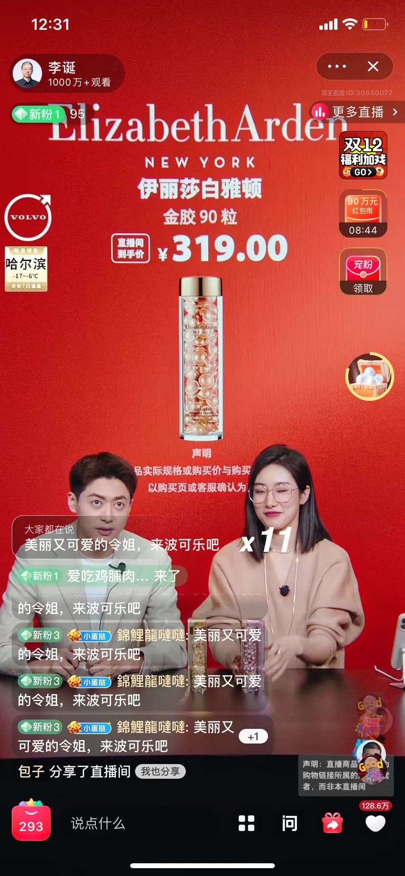 12月10日晚上,李誕7點鐘現(xiàn)身直播間,先從外場介紹沃爾沃汽車開始,然后到內場,開始介紹各種類別的商品。直播間5分鐘之內就達到了4萬人,到接近11點的時候,觀看人數(shù)早已過千萬。