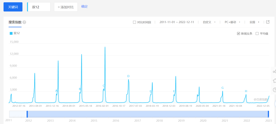 雙12不再如以往般受關注,也是事實。如下圖百度指數(shù)顯示,“雙12”活動在2016年之前,熱度指數(shù)均呈上升趨勢,但此后便“一蹶不振”,熱度在2018年攀升至一個小高潮后又迅速隕落,2018年至今,熱度逐年遞減。