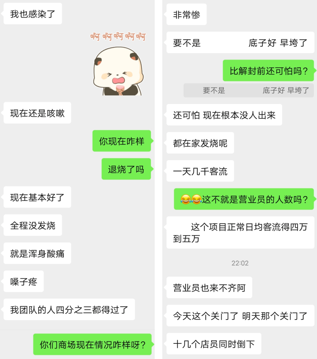 我問了河北的小伙伴,他和他的大部分團(tuán)隊(duì)都“陽”了,原先日均4、5萬客流的商場,如今一天只有幾千客流,各個(gè)店鋪也因?yàn)闋I業(yè)員陸續(xù)中招而無法維持穩(wěn)定營業(yè)。