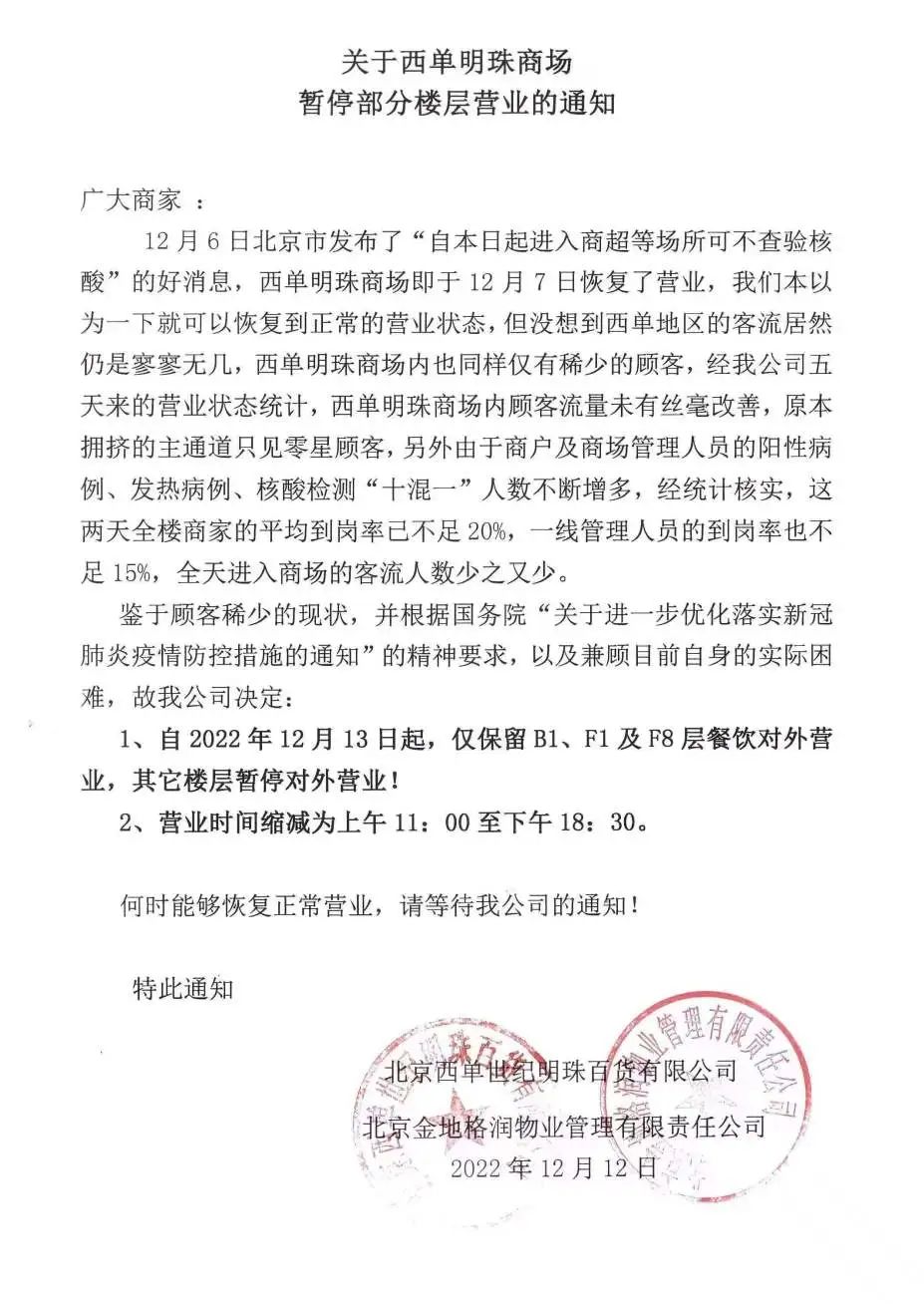 12月12日,本是“雙十二”促銷的日子,位于北京最繁華的西單商圈的西單明珠商場卻因?yàn)楦腥救藬?shù)太多,“全樓商家的平均到崗率已不足20%,一線管理人員的到崗率也不足15%,全天進(jìn)入商場的客流人數(shù)少之又少”,而發(fā)布通知,除B1、F1及F8層餐飲外,其它樓層暫停對外營業(yè),營業(yè)時(shí)間也縮短至午11:00-18:30。