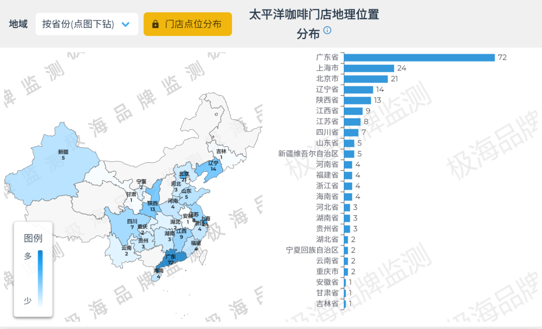 品牌整體布局以一線和新一線城市為主,太平洋咖啡在廣東省有72家門店,上海市24家,北京市21家,遼寧省14家,陜西省13家,其他省份的門店數量僅為個位數,影響力有限。