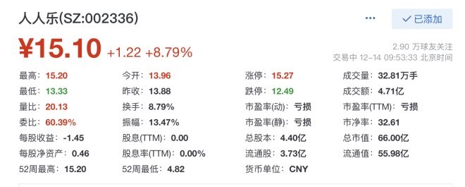 盡管人人樂發(fā)出澄清公告,12月14日開盤后,人人樂股價依舊上漲,并一度上探至每股15.2元,相比12月6日開盤價7.78元,在短短6個交易日內(nèi),人人樂股價已經(jīng)暴漲95.37%。