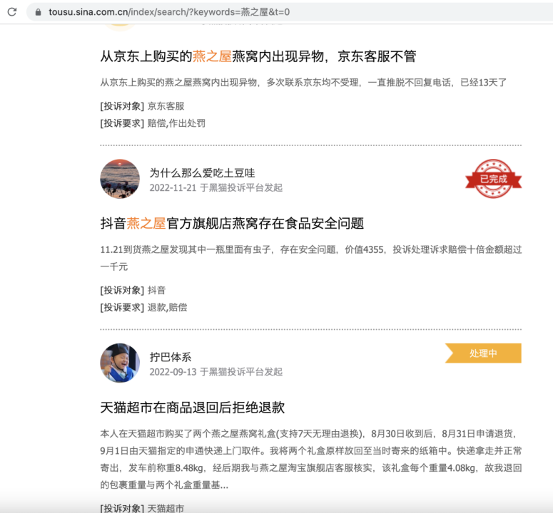 城門失火殃及池魚。對于整個燕窩行業(yè)來講,單個品牌出事,整個行業(yè)的產品信譽都在一定程度上受到損傷。從黑貓投訴平臺了解到,有關燕之屋“以次充好”、“假冒商品”等投訴時有發(fā)生;而產品質量問題和造假風波的屢見不鮮,不僅僅傷害了消費者的合法權益,對于整個行業(yè)而言,更是一次又一次無法挽救的信譽傷害。