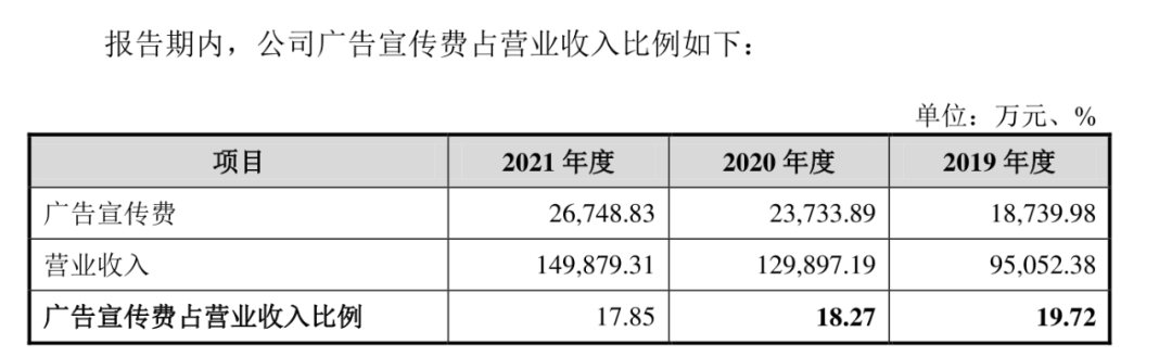 招股書顯示,2019年至2021年,燕之屋廣告宣傳費為1.87億元、2.37億元和2.67億元,分別占銷售費用的60.84%、74.93%和68.37%,分別占營收的比例為19.72%、18.27%、17.85%。