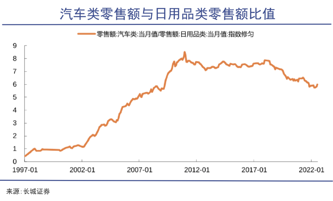 中國所面臨的“后地產(chǎn)時代”的實際情況,讓消費降級現(xiàn)象早已出現(xiàn)。長城證券的數(shù)據(jù)顯示,自2018年起,汽車類零售額與日用品類零售額的比值開始下降,這一定程度折射可選消費與必需消費的比值下降,也說明了中國存在部分消費降級的現(xiàn)象。