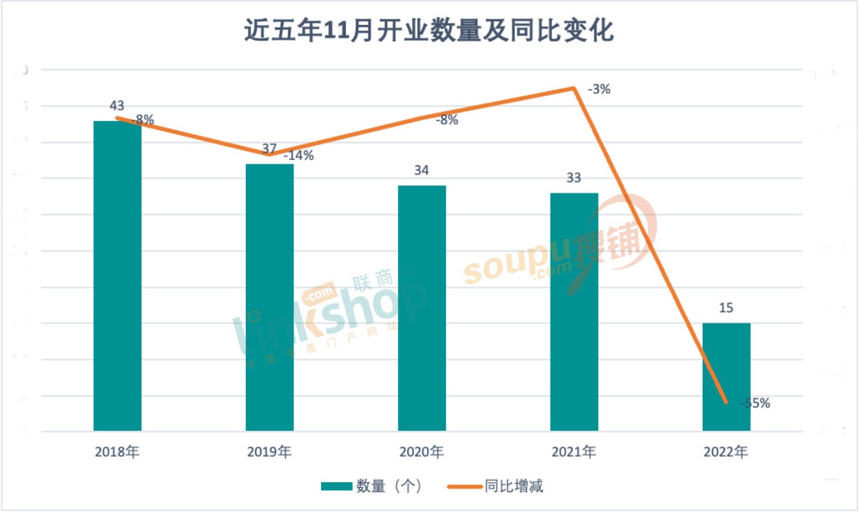 相比往年,今年11月開(kāi)業(yè)數(shù)量是近五年最低的,下跌幅度至55%。而從近五年的情況上看,自2018年開(kāi)始,每年11月的開(kāi)業(yè)數(shù)量均呈現(xiàn)下滑趨勢(shì),體現(xiàn)商業(yè)地產(chǎn)商開(kāi)發(fā)態(tài)度的謹(jǐn)慎。同時(shí),受疫情影響整體大環(huán)境不佳,被迫延期開(kāi)業(yè)的項(xiàng)目居多。