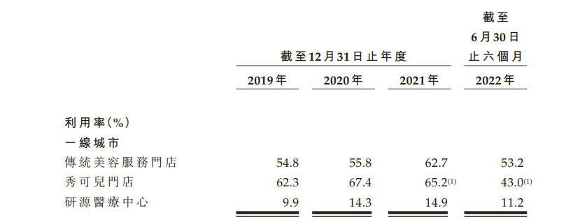 但今年上半年門(mén)店的利用率卻大幅下降,導(dǎo)致一線城市收入同比下滑了26%。其中,傳統(tǒng)美容店今年上半年的利用率為53.2%、秀可兒門(mén)店利用率為43%,均低于此前3年的門(mén)店利用率。