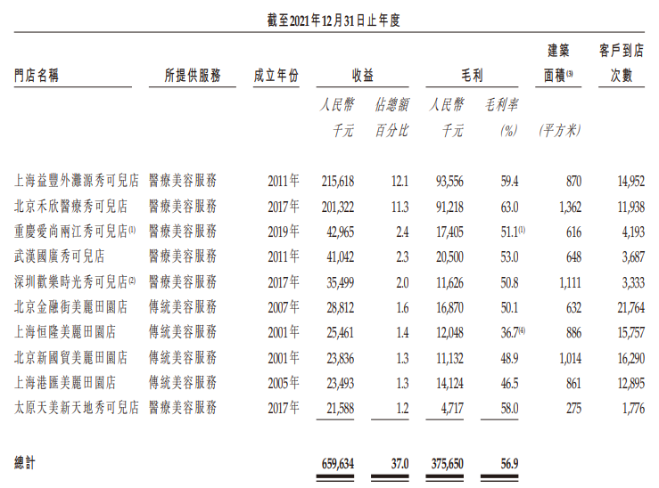 從招股書(shū)可知,去年排名前10的店鋪總收益為6.6億元,占總收入比重達(dá)到37%。上海與北京各有一家醫(yī)美門(mén)店年收益超過(guò)2億元。從前10店鋪看,美麗田園旗下門(mén)店的面積最大的上千平方米,最小的也有275平米。