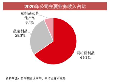 據(jù)衛(wèi)龍更新的招股書顯示,衛(wèi)龍調(diào)味面制品主要包括大面筋、小面筋、麻辣棒、小辣棒和親嘴燒等辣條產(chǎn)品,2019年至2021年以及2022年,調(diào)味面制品合計(jì)占公司主營(yíng)業(yè)務(wù)收入的73.1%、65.3%、60.8%和59.3%。也就是說,辣條占比一直在六成左右。