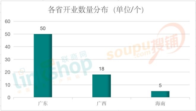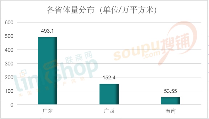 從體量上看,排序與開(kāi)業(yè)數(shù)量一致。廣東以493.1萬(wàn)方穩(wěn)居榜首,廣西152.4萬(wàn)方、海南53.55萬(wàn)方。