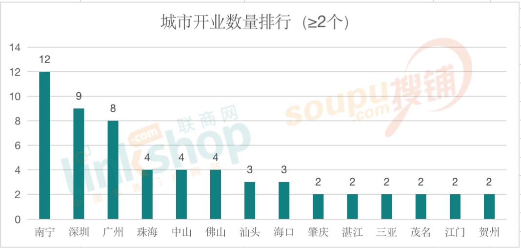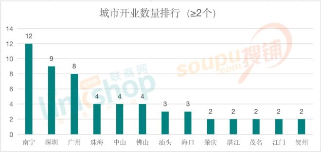 從城市的活躍度上看,根據(jù)實(shí)際統(tǒng)計(jì)情況,以開(kāi)業(yè)數(shù)量≥2個(gè)為標(biāo)準(zhǔn)統(tǒng)計(jì)的城市活躍TOP13榜中,南寧以12個(gè)開(kāi)業(yè)量穩(wěn)居榜首,深圳和廣州兩大城市分別以9個(gè)和8個(gè)緊隨其后。