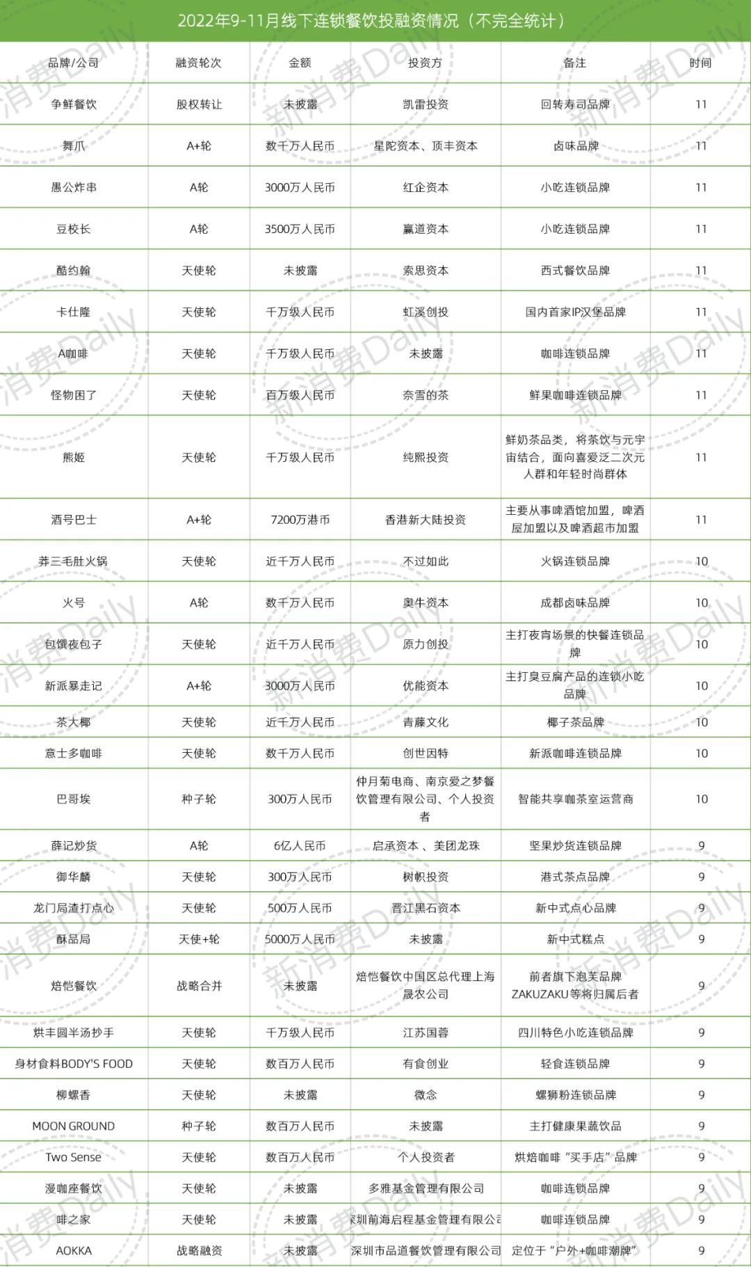 實際上,據(jù)新消費Daily不完全統(tǒng)計,在剛剛過去的9-11月,共有30個線下連鎖餐飲品牌獲得融資,其中炸串、炸臭豆腐、烘焙這些偏小吃類型的項目更備受青睞。