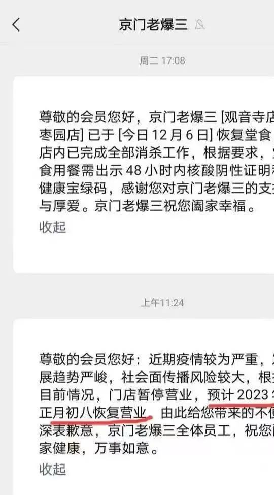 像北京的京門老爆三,就在其官方公號(hào)發(fā)布消息稱,“由于近期疫情較為嚴(yán)重,發(fā)展趨勢(shì)嚴(yán)峻,社會(huì)面?zhèn)鞑ワL(fēng)險(xiǎn)較大,根據(jù)目前情況,門店暫停營(yíng)業(yè),預(yù)計(jì)2023年正月初八恢復(fù)營(yíng)業(yè)”。