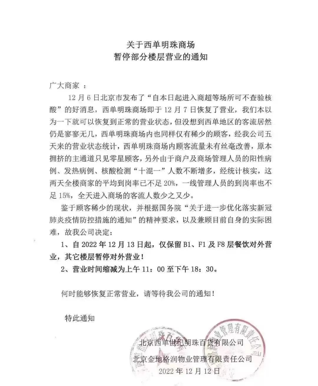 12月12日,北京西單明珠商場(chǎng)發(fā)布了一則通知,宣布從13日起將暫停部分樓層營(yíng)業(yè)。7號(hào)剛剛恢復(fù)營(yíng)業(yè),但因?yàn)榭土髁攘葻o(wú)幾,商戶和商場(chǎng)管理人員陽(yáng)性人數(shù)不斷增多,商家平均到崗率不足20%,一線管理人員到崗率不足15%。