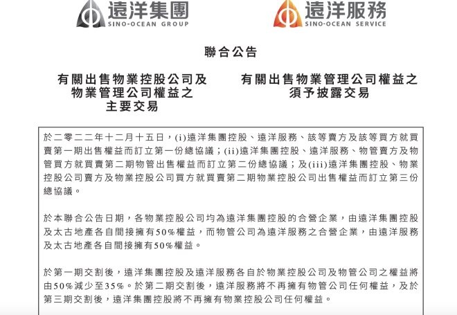據(jù)悉此次交易將分三次完成。第一次交易完成后,遠洋集團和遠洋服務各自權(quán)益將從50%減少至35%;第二次交易完成后,遠洋服務將不再持有物管公司任何權(quán)益;第三次交易完成后,遠洋集團將不再持有物業(yè)控股公司任何權(quán)益。