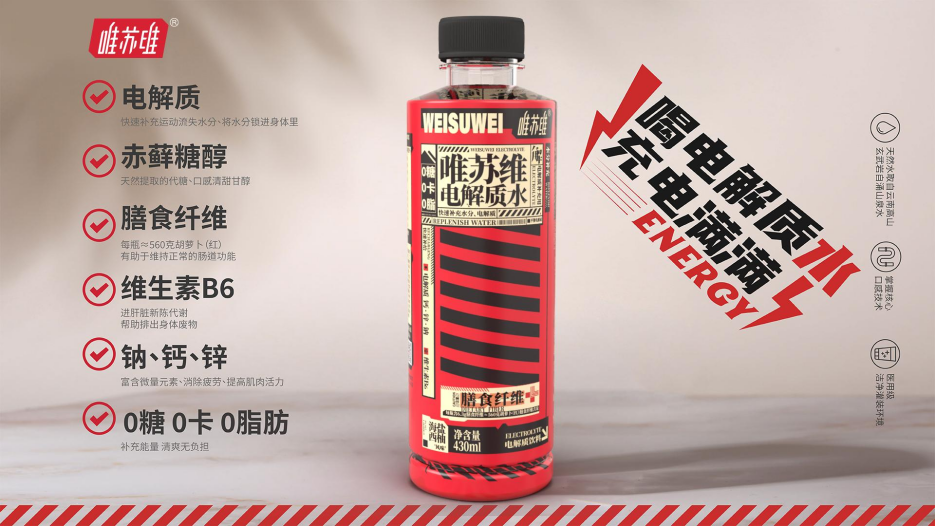 唯蘇維電解質(zhì)水不僅富含人體所需的電解質(zhì),還添加煙酸保持身體活力給消費(fèi)者帶來滿滿的活力。