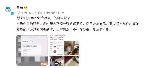 再比如,今年3月份,盒馬被傳售賣活體鱷魚,盒馬鮮生相關工作人員告訴澎湃新聞,經專業(yè)人士觀察判斷,網傳視頻中的鱷魚本身是活體,與盒馬銷售的鱷魚規(guī)格不符,初步判斷并非在盒馬所購買。