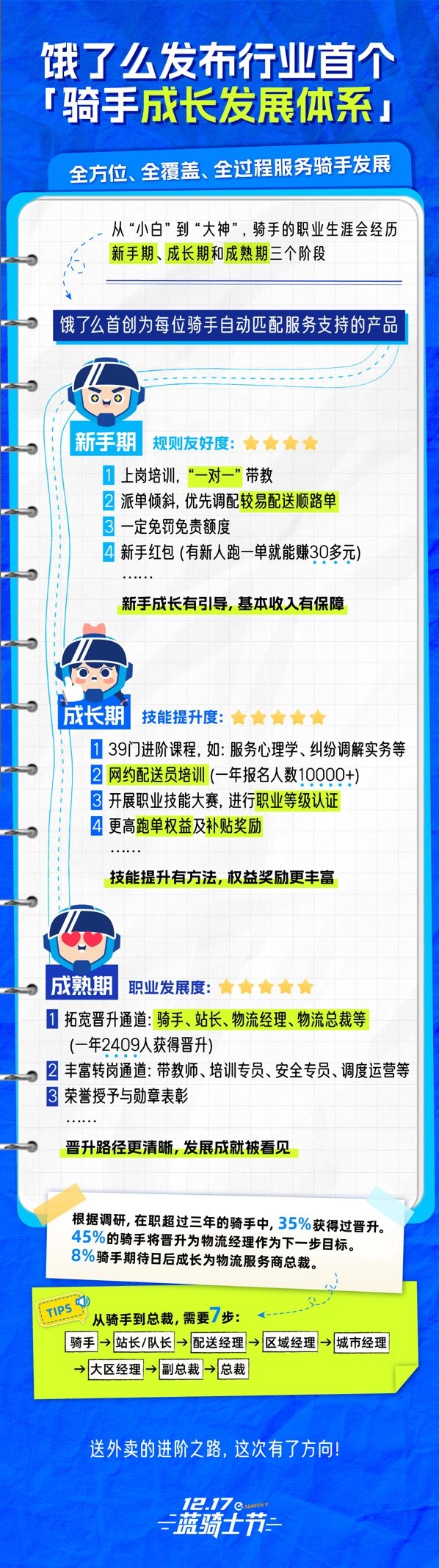 12月17日,在第五屆餓了么藍(lán)騎士節(jié)上,騎手們分享起自己的成長(zhǎng)之路。過去一年,2409名騎手晉升至站長(zhǎng)及更高崗位,其中285人成為物流經(jīng)理。當(dāng)天,餓了么發(fā)布行業(yè)首個(gè)“騎手成長(zhǎng)發(fā)展體系”,為騎手不同成長(zhǎng)周期提供支持產(chǎn)品,全方位、全覆蓋、全過程服務(wù)騎手發(fā)展。