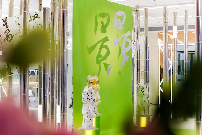 這里有《門(mén):抵達(dá)·未知》當(dāng)代藝術(shù)品聯(lián)展、《大漆無(wú)形》創(chuàng)新漆藝漆畫(huà)展、《明河流影》科技創(chuàng)新書(shū)法展,融合傳統(tǒng)本土與現(xiàn)代新潮之美;這里還有各門(mén)類(lèi)藝術(shù)有趣的跨界嘗試:以“極致萌態(tài)”撫慰人心的《尋夢(mèng)精靈》萌萌、溫暖治愈的《獵戶(hù)座懸臂奧爾特云植物系》花藝裝置、Bong Ants熱烈多彩畫(huà)作與多媒體互動(dòng)屏的配搭……