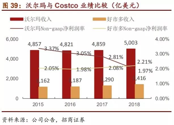 Costco的費(fèi)用率處于10%左右的水平,遠(yuǎn)低于沃爾瑪20%左右的費(fèi)用率。