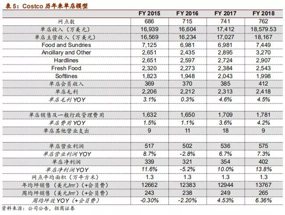 從單店以及坪效來(lái)看,近幾年來(lái),Costco的同店銷售額增長(zhǎng)以及單位面積業(yè)績(jī)均優(yōu)于沃爾瑪。沃爾瑪甚至出現(xiàn)過(guò)同店負(fù)增長(zhǎng)的情況,而Costco的同店由于消費(fèi)頻率的提升以及客單價(jià)的提升,增速遠(yuǎn)高于同行,排除加油站影響,2018年同店增速為6.8%。