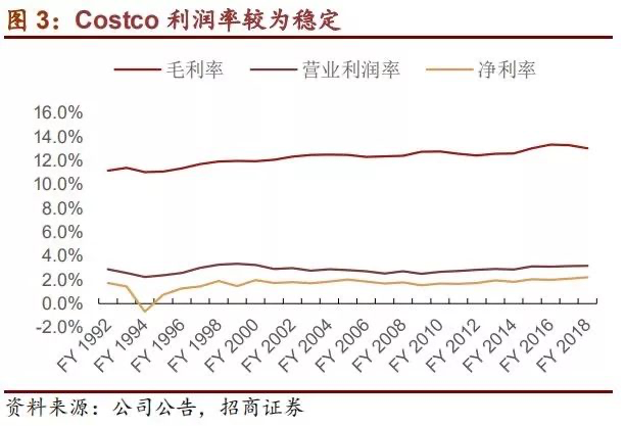 Costco在2005年生鮮占比11%,2018年生鮮占比14%,生鮮占比穩(wěn)中有升。