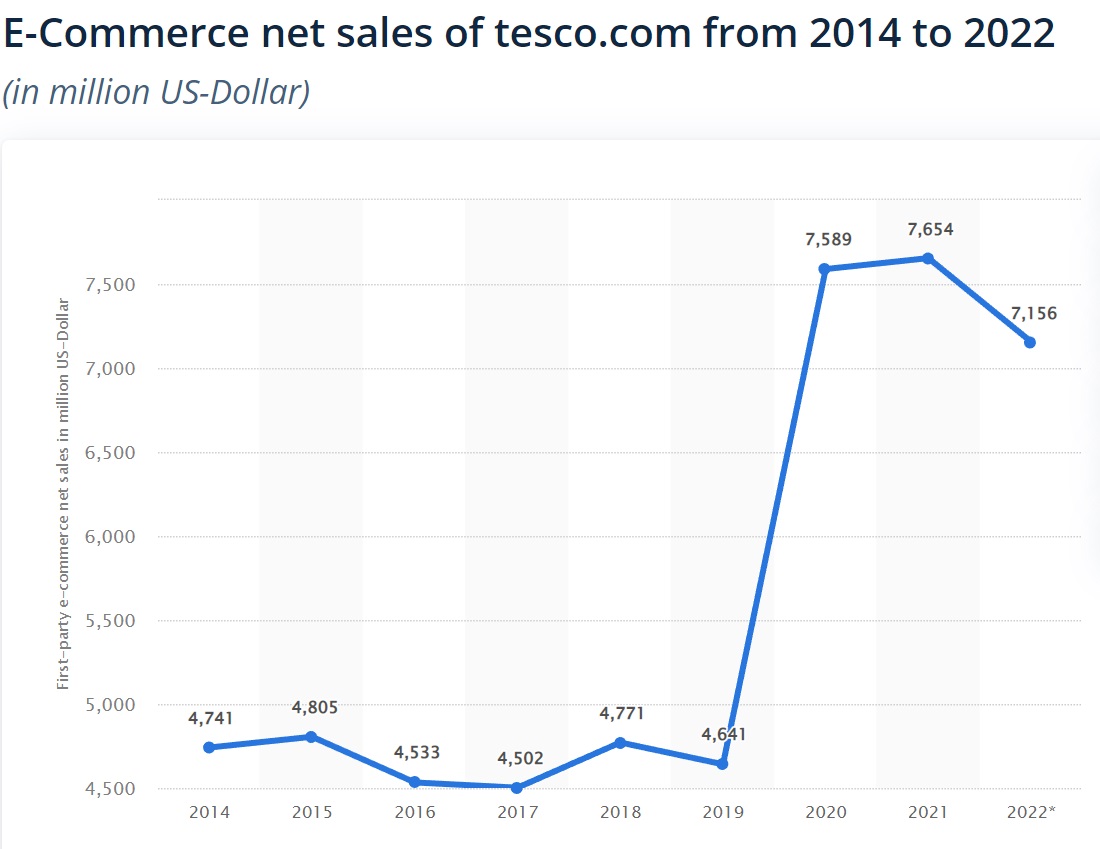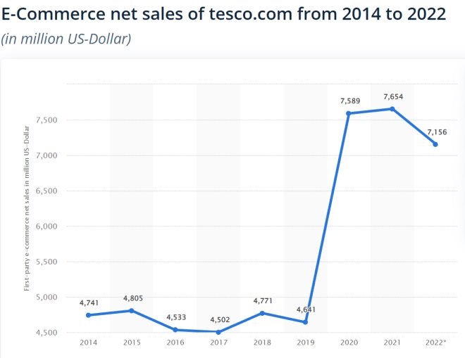 樂(lè)購(gòu)線上平臺(tái)(Tesco.com)2014年至2022年凈銷售額(圖源:Statista)