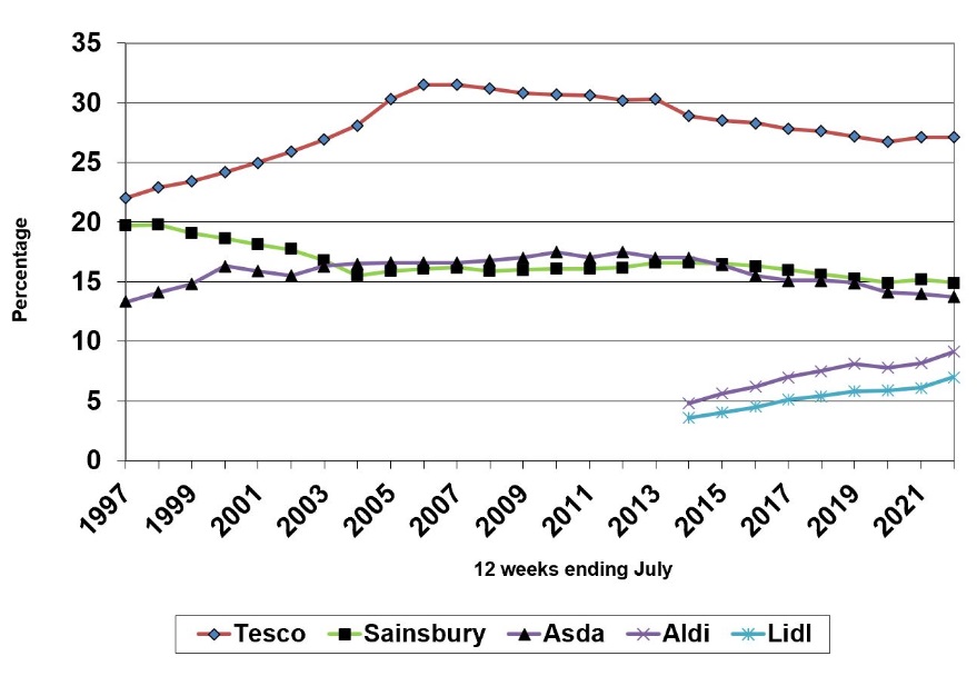 1997-2022年英國(guó)的超市零售商市場(chǎng)份額(圖源:Kantar官網(wǎng))