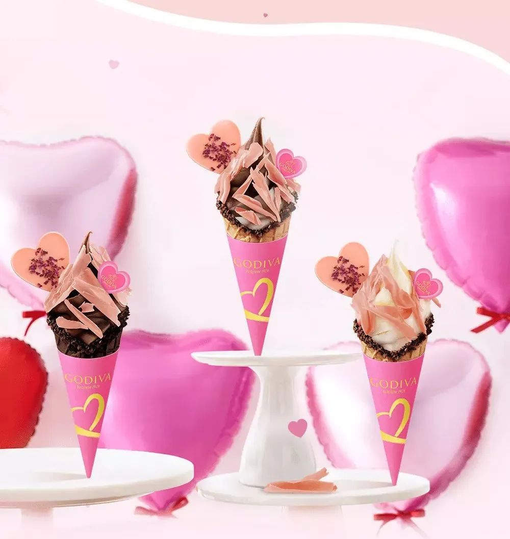GODIVA則在今年推出了情人節(jié)限定軟冰淇淋系列,以粉色為主色調(diào),冰淇淋上插入了玫瑰花瓣和由粉色巧克力制作的心形、花瓣形裝飾物,華夫筒邊緣還裹有巧克力醬和榛果餅干碎,彰顯出浪漫。