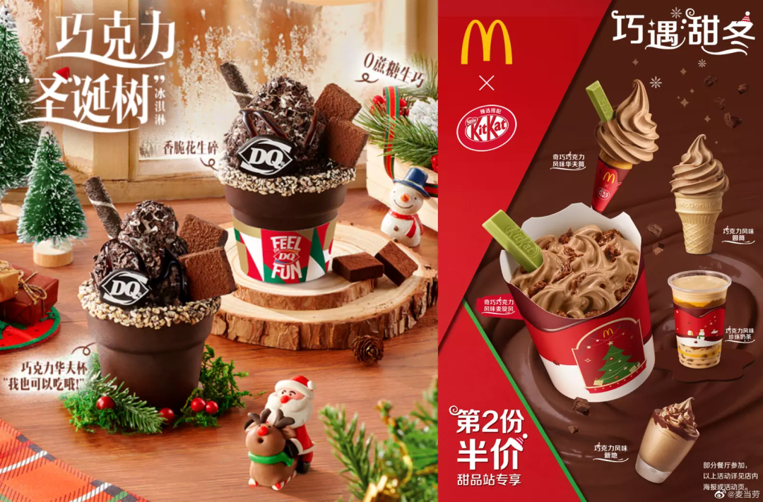 大品牌們的動(dòng)作往往是比較早的,11月底,DQ就開(kāi)始預(yù)告今年的圣誕新品“巧克力圣誕樹(shù)冰淇淋”將于12月1日正式上市,所使用的元素仍然是冬季較受歡迎的巧克力、榛子等,并搭配巧克力華夫杯制成圣誕樹(shù)的造型,討巧可愛(ài)。麥當(dāng)勞則是與KitKat聯(lián)名上新奇巧巧克力麥旋風(fēng)、華夫筒,用綠色的KitKat威化映襯出圣誕氛圍。