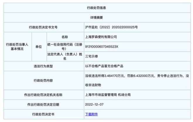天眼查App顯示,日前,上海羅森便利有限公司因以不合格產(chǎn)品冒充合格產(chǎn)品,被上海市監(jiān)局機(jī)場(chǎng)分局罰款6.4萬(wàn)余元,并沒(méi)收違法所得3.4萬(wàn)余元。