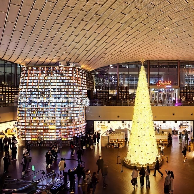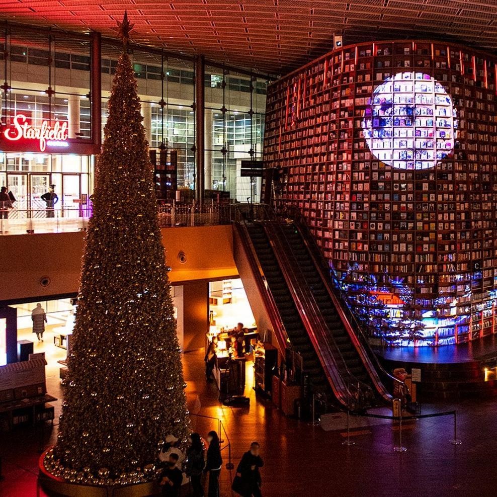 主題:#Winter Wonderland,冬日奇緣。今年COEX購物中心的最大亮點是STARFIELD LIBRARY是位于購物中心中央的星空圖書館。填滿整個購物中心廣場的高聳云天的書架以及里面整齊排放的書籍打造出既雄偉又漂亮的風景,在圖書館中央佇立著一顆金色的圣誕樹。