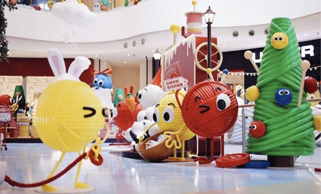 上海虹橋天地以原創(chuàng)IP毛線精靈為主人公,打造擬人化的形象和場景,傳遞幸福與溫情。一樓中庭的「毛線織造營」場景,設置了魔法雪橇、棉棉車縫間、滑雪大PK、織物暖陽、心愿喜兔五個陳設。