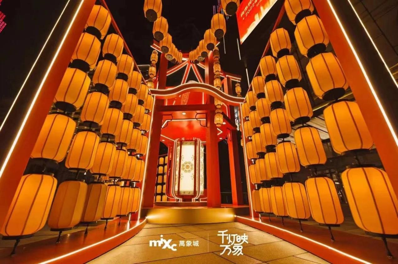 青島萬象城打造千燈映萬象新年主題展,還原熙攘盛世繁華。洋溢新年氛圍的紅色色調(diào),搭配黃燈籠的星星點綴,身著漢服的表演者穿梭在古時場景之中,一派祥和喜氣。