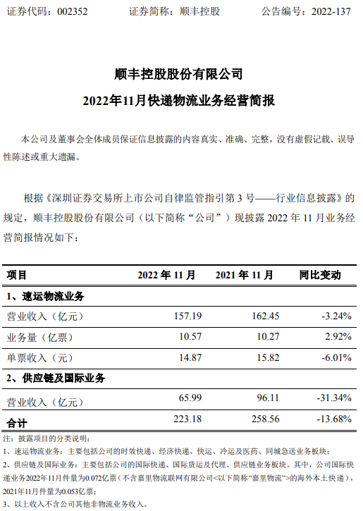 順豐的11月經(jīng)營(yíng)簡(jiǎn)報(bào)顯示,其速運(yùn)物流業(yè)務(wù)營(yíng)收下降3.24%至157億元,主要原因是單票收入減少了6.01%。與之相反的是,在行業(yè)整體業(yè)務(wù)量下滑之際,順豐的業(yè)務(wù)量卻出現(xiàn)了2.92%的上漲。