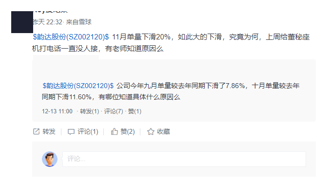 投資者論壇上,已經(jīng)有人對(duì)韻達(dá)單量的連續(xù)大幅下滑產(chǎn)生了質(zhì)疑,但韻達(dá)暫未做出正面回應(yīng)。