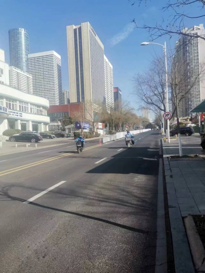 工作日中午的青島CBD主干道,平時(shí)車流涌動(dòng),如今竟接近“清零”