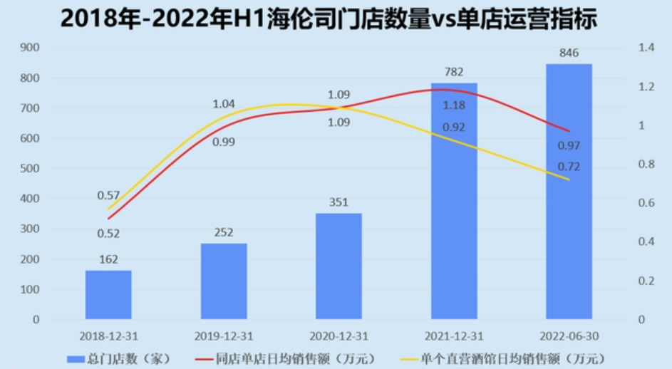 下滑的翻臺率需要用更高的客單價來彌補,但海倫司單店銷售業(yè)績正在下滑。數(shù)據(jù)顯示,海倫司同店單店日均銷售額已由2020年的1.09萬元,降至今年上半年的9700元,而單個直營酒館的日均銷售額也呈現(xiàn)出同樣的趨勢,從1.09萬元下滑至7200元。