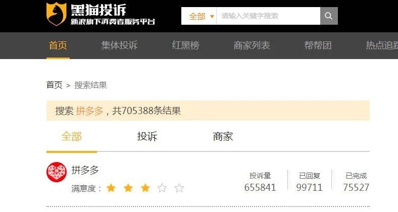 據(jù)新浪黑貓投訴和微博熱點(diǎn)在今年3月聯(lián)合發(fā)布的《2021年消費(fèi)者權(quán)益保護(hù)白皮書》顯示,購物平臺是2021年被投訴最多的行業(yè),投訴量達(dá)25.58%。在這之中,拼多多以超42萬宗的投訴量,居全網(wǎng)各平臺之首。截至發(fā)稿,在黑貓投訴平臺與拼多多有關(guān)的投訴已超65萬。