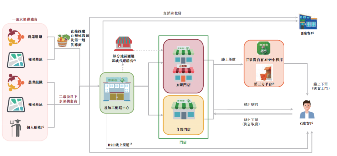 同時,通過手機百果園APP、微信小程序,天貓、京東及抖音等電商及社交商務(wù)平臺旗艦店以及與美團、餓了么等第三方外賣平臺旗艦店為消費者提供便利及多樣的線上購物選擇。店倉一體化能夠提升配送效率,擴充門店銷售范圍,以及降低履約成本,從而實現(xiàn)好吃不貴的高性價比。
